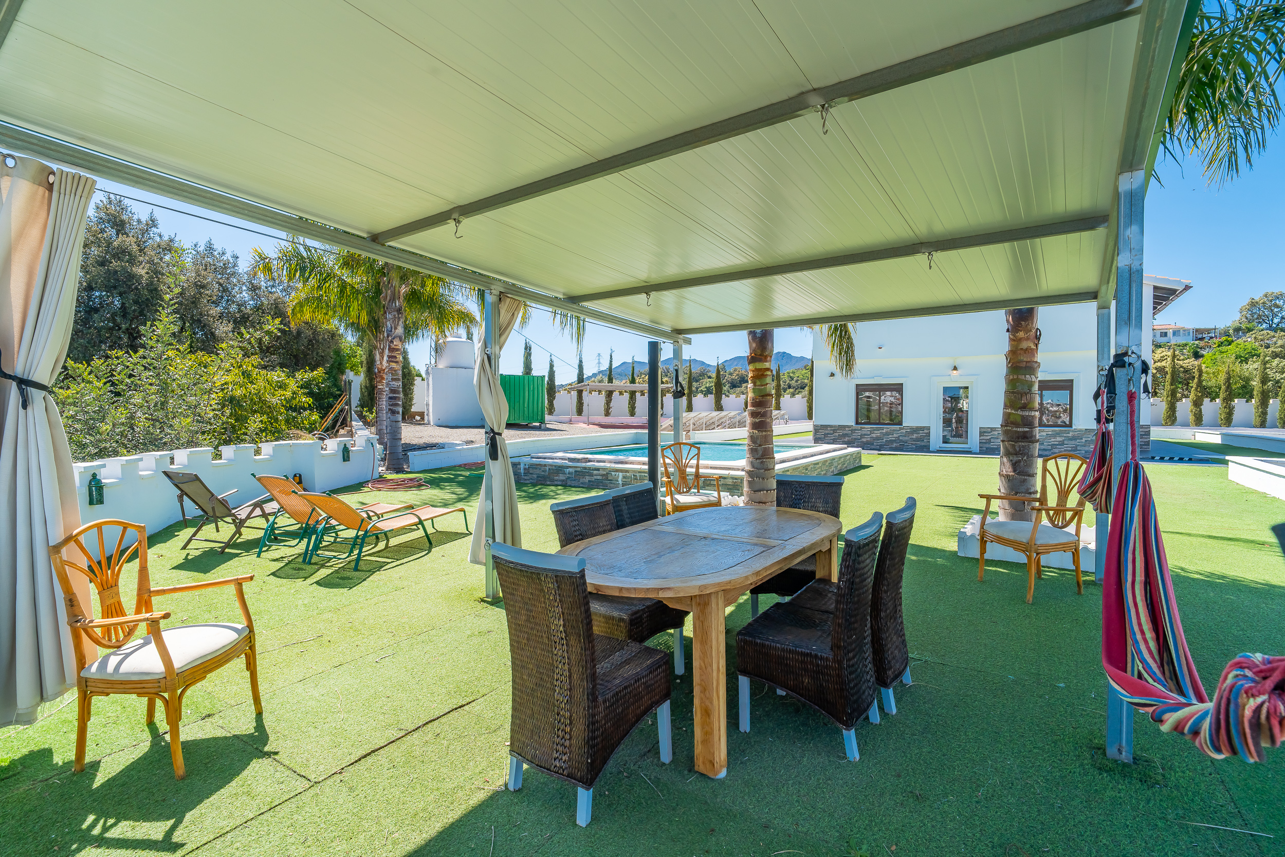 The property features extensive outdoor areas, including a private swimming pool, well-maintained gardens, a barbecue area, and parking space, as well as solar panels, mains water supply, and well water.